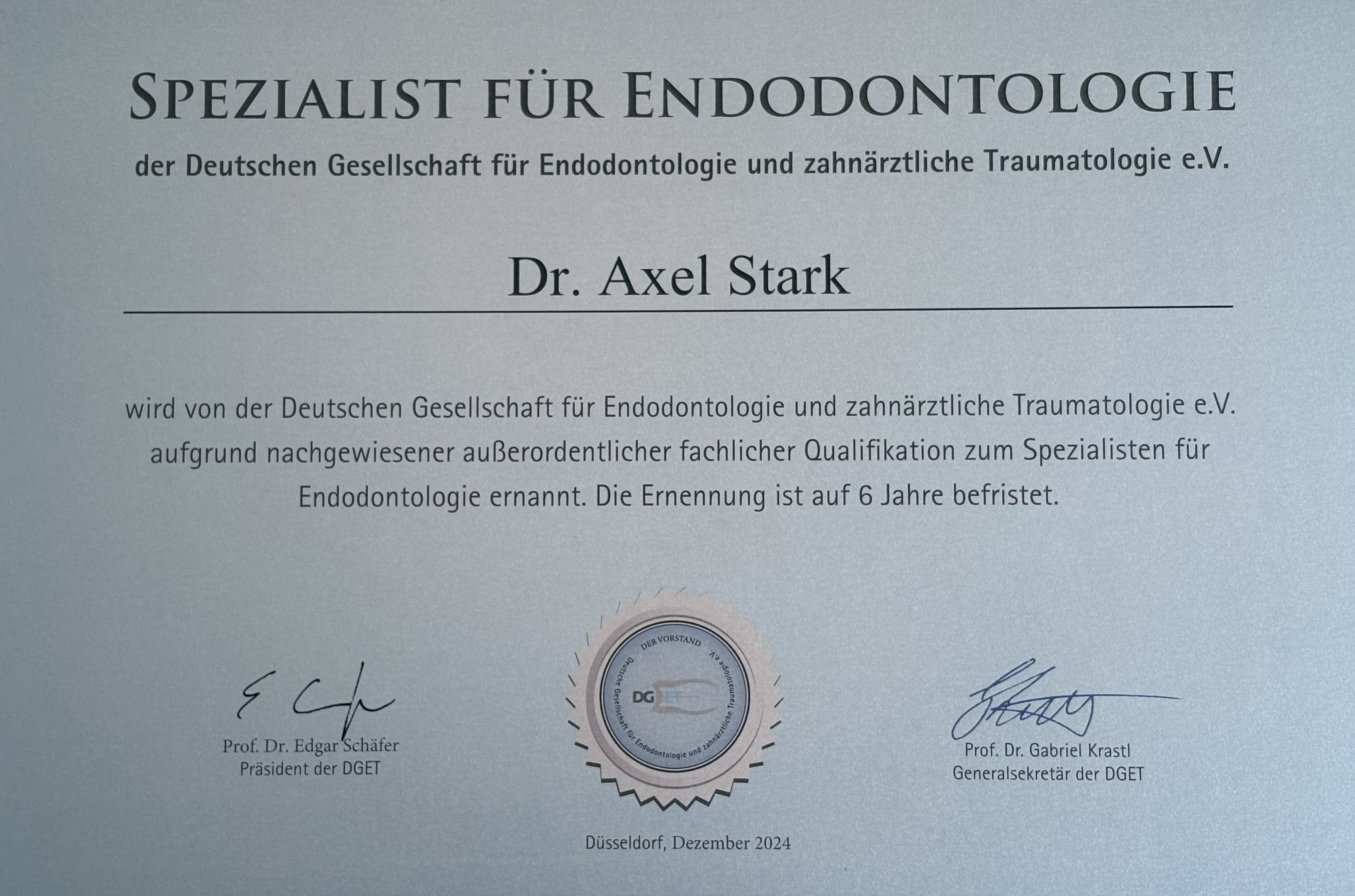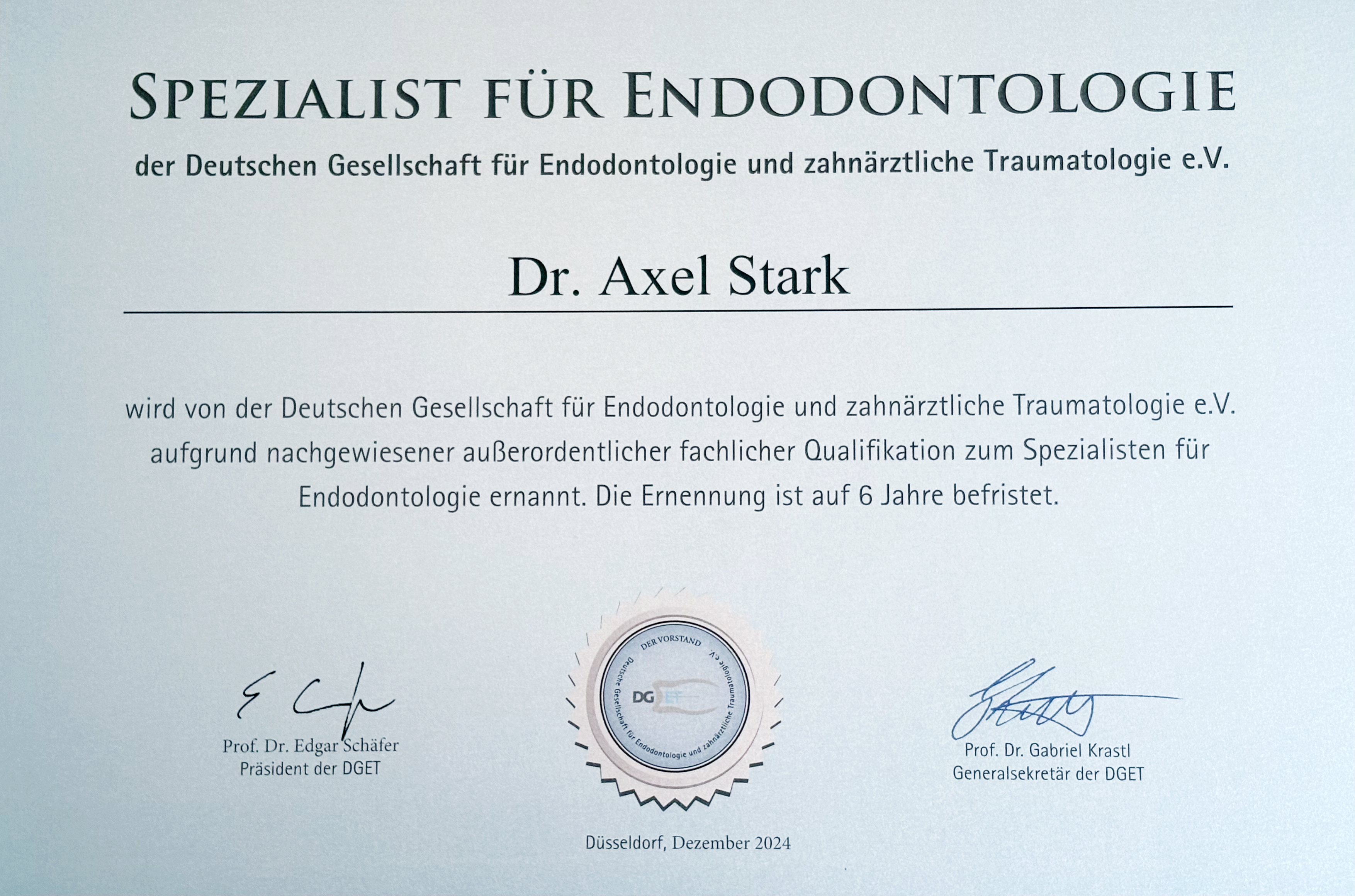 | 12/2006 | Ernennung zum Spezialisten für Endodontie der DGEndo (Deutsche Gesellschaft für Endodontie, heute DGET) |